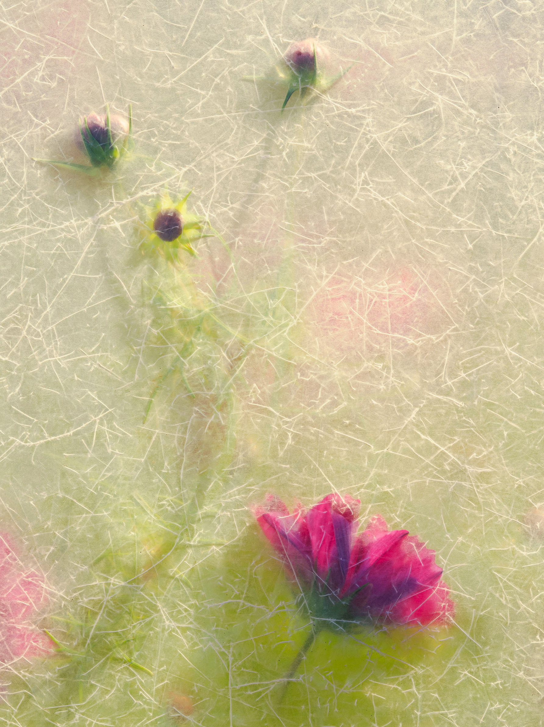 As I walked through the allotment on a bright, late summer morning, I noticed some flowers stuck against the inside of a polytunnel. I took a few phone shots and liked the results, so went back with the "big" camera again and again in different conditions.